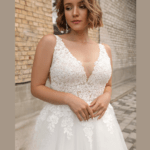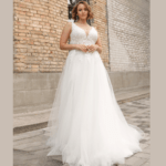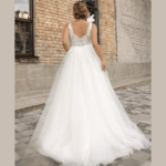 Vestido de Noiva corte A, feito em tule e renda.