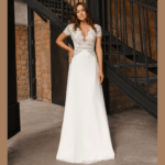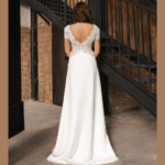Vestido de Noiva corte A, feito em crepe stretch e renda.