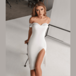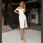 Vestido de Noiva corte A, curto, feito em crepe stretch.