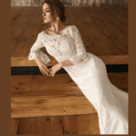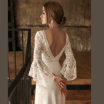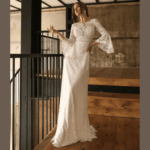 Vestido de Noiva corte A, feito em crepe stretch e renda.