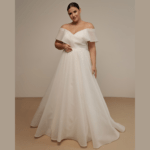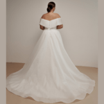 Vestido de Noiva corte princesa com cauda, decote ombro a ombro, feito em organza com glitter.