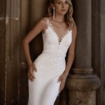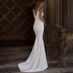 Vestido de Noiva corte sereia, fabricado em crepe stretch, tule e rendas com pedraría.