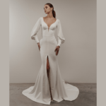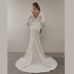 Vestido de Noiva, corte sereia, decote em coração,  mangas comprida estilo balão, feito em crepe.