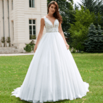Maravilhoso vestido de noiva corte princesa, decote em V, feito em tule brilhante e renda, decorado com pedraría.