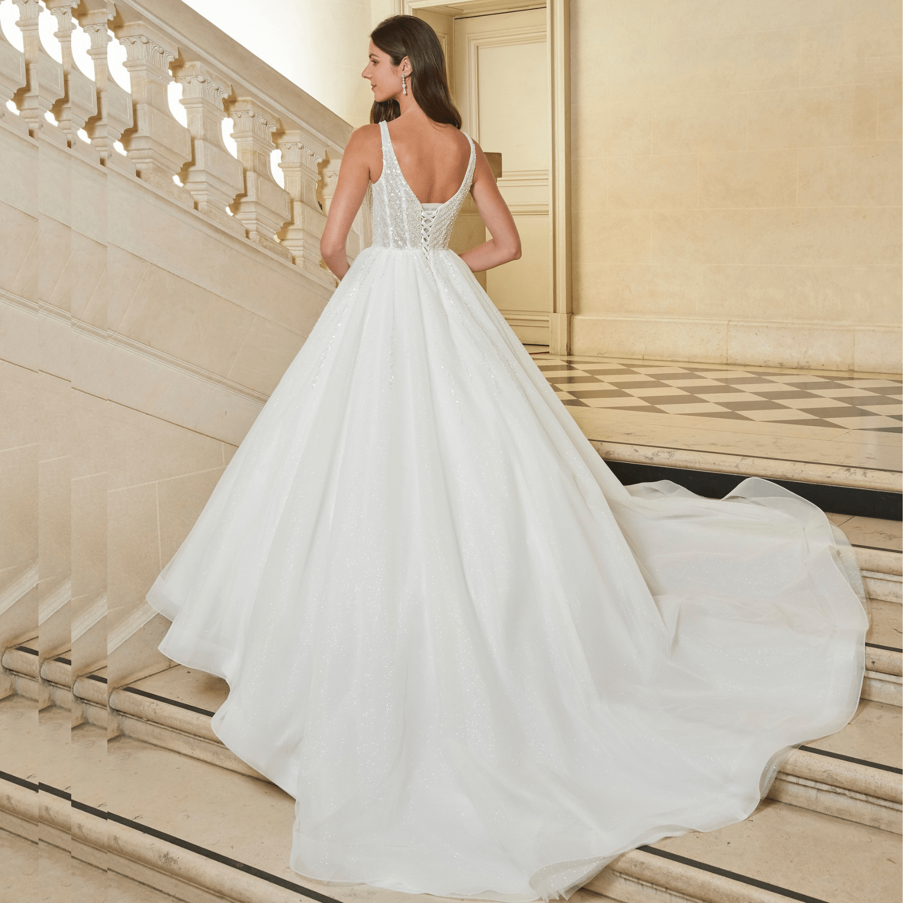 Maravilhoso vestido de noiva corte princesa, decote em V, feito em tule brilhante e pedraria.
