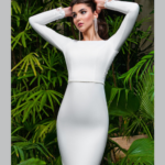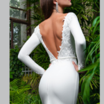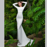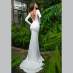 Vestido de Noiva, corte sereia, decote redondo, feito em crepe.