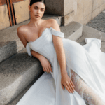 Vestido de Noiva, corte A, decote cai cai, com alças descaidas.