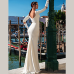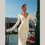 Vestido de Noiva, corte sereia, decote em V, mangas 3/4, feito em crepe.