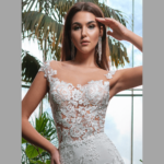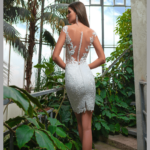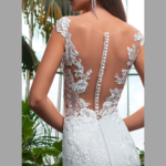 Vestido de Noiva curto, decote redondo ilusão, com botões, feito em tule e renda com alta qualidade.