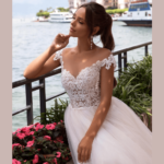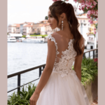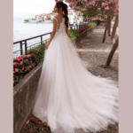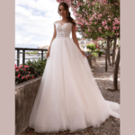 Vestido de Noiva corte A, feito em renda e tule brilhante.