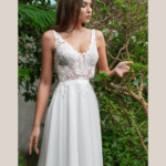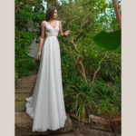 Vestido de Noiva corte A, decote e costas em V, feito em renda e chiffon.