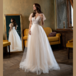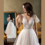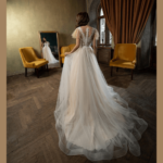 Vestido de Noiva corte A, feito em renda e tule brilhante.