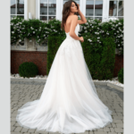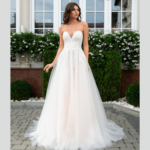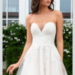 Vestido de Noiva, corte A, decote cai cai em forma de coração, feito em tule e rendas