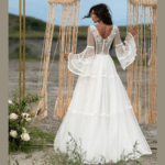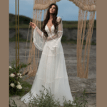 Vestido de Noiva, corte A, decote em V, feito em tule e renda com pedraría no peito.