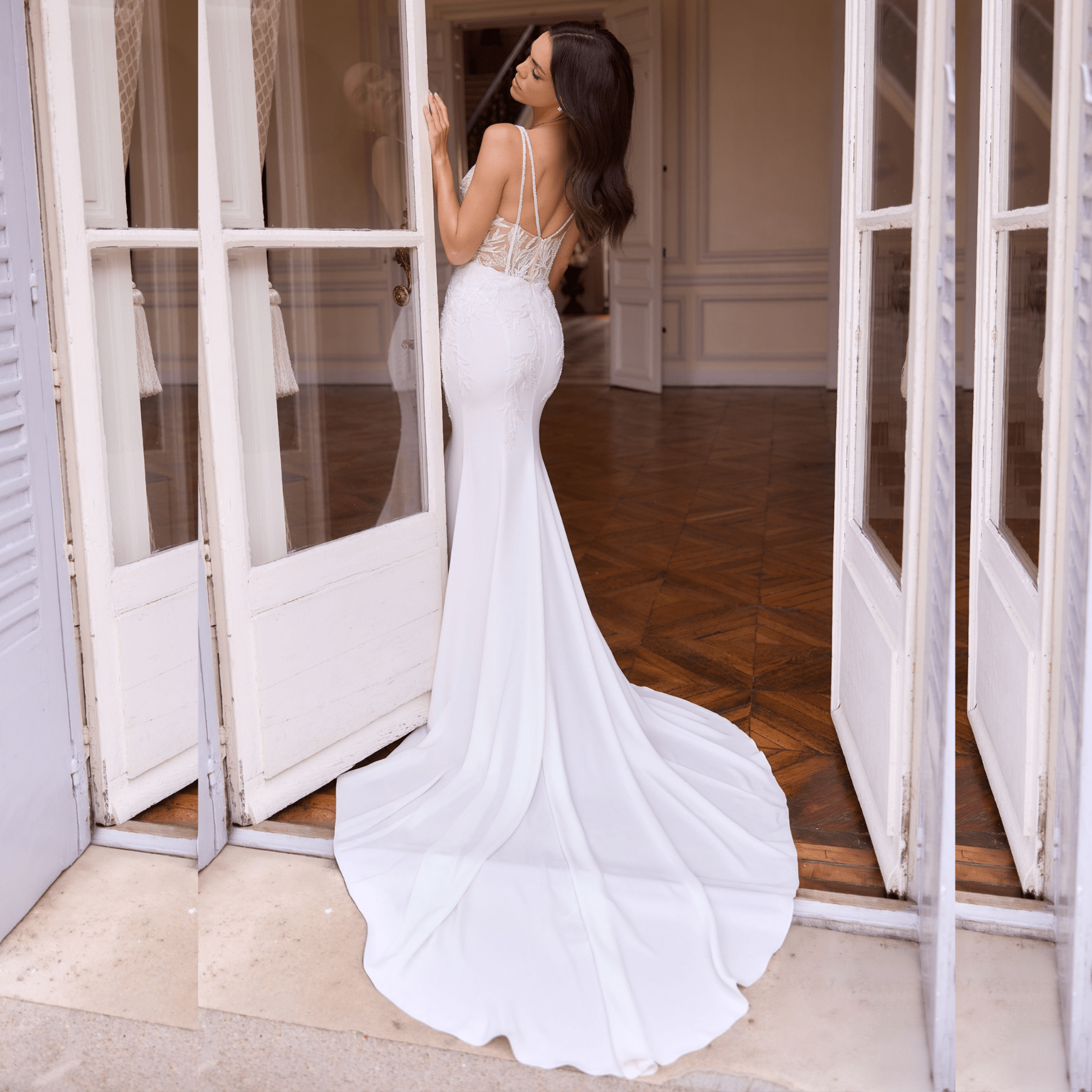 Vestido de Noiva corte sereia, decote em V profundo, feito em crepe.