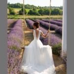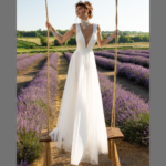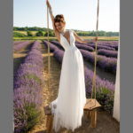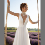 Vestido de Noiva, corte A, decote em V, feito em sablé e tule.