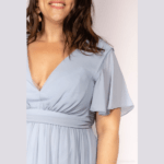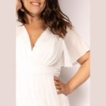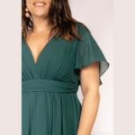 O detalhe mestre reside na cintura: um cinto drapeado frontal que define as formas com elegância artesanal, aliado a um elástico discreto na parte posterior, garantindo um ajuste personalizado e impecável durante todo o evento. As mangas meia tipo mariposa acrescentam um movimento etéreo e romântico, proporcionando a cobertura ideal com uma leveza inigualável. O visual culmina num subtil decote em V nas costas, assegurando um impacto visual sofisticado em 360 graus