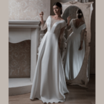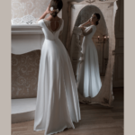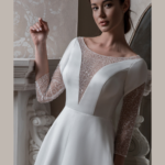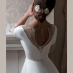 Vestido de Noiva, corte A, decote redondo, mangas 3/4, feito em crepe e tule.