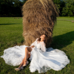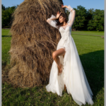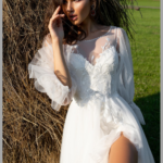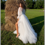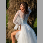 Vestido de Noiva corte A, com mangas, decote em coração ilussão, feito tule e renda.