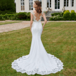 Maravilhoso vestido de noiva corte sereia, decote em V, feito em crepe e renda.