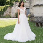Maravilhoso vestido de noiva corte A, decote em V com mangas curtas, feito em tule brilhante e renda, decorado com pedraría.