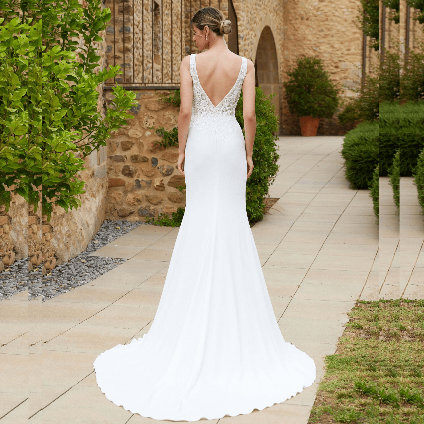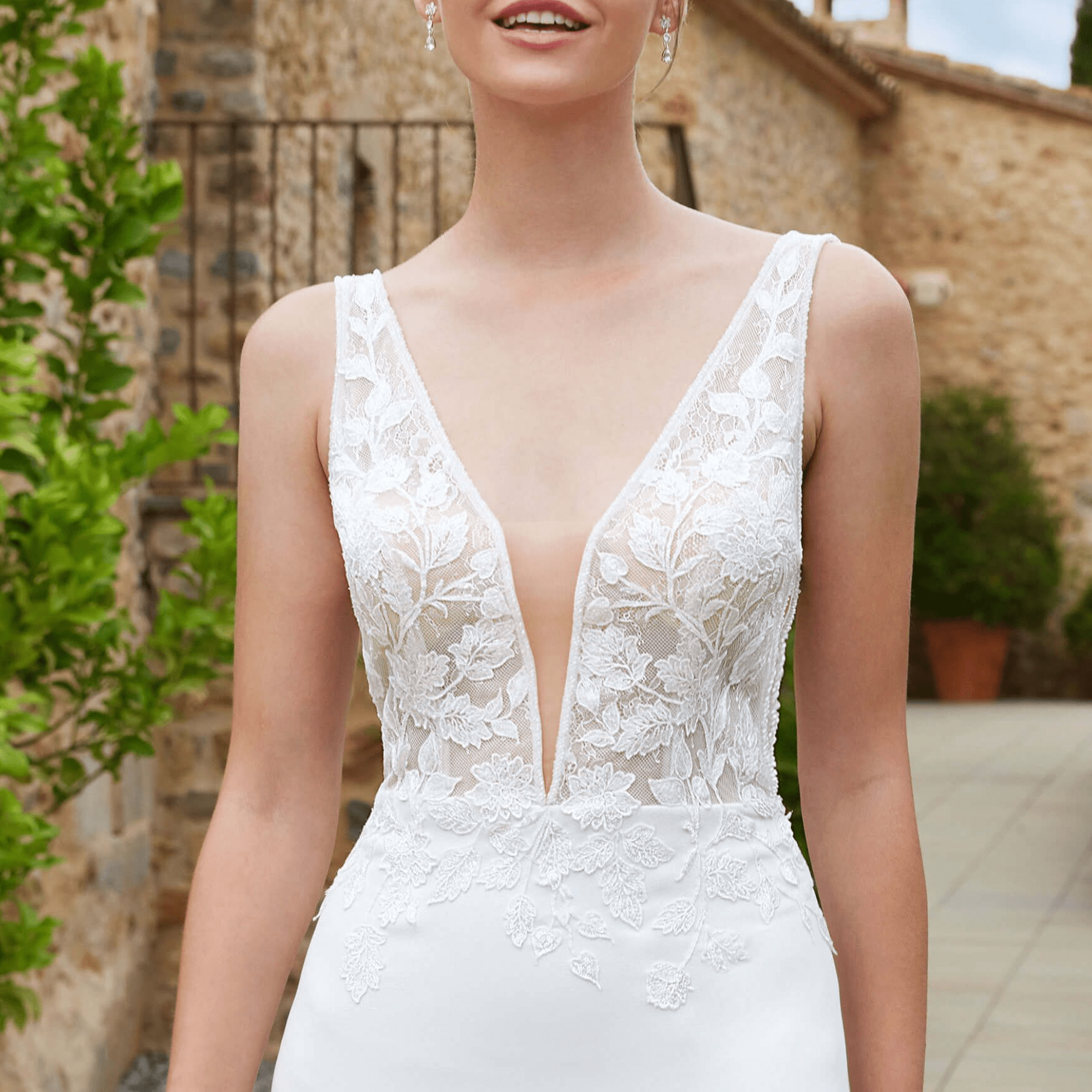 Vestido de Noiva corte sereia, decote em V profundo, feito em georgette e renda.