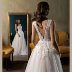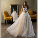 Vestido de Noiva corte A, feito em renda e tule brilhante.