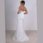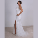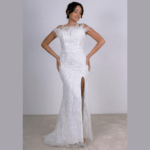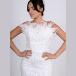 Vestido de noiva corte sereia, decote em coração decorado com penas, feito em tule brilhante.