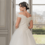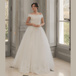 Vestido de noiva corte princesa, decote ombro a ombro reto, feito em tule e renda.