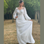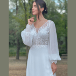 Vestido de noiva corte A, decote em V, com mangas compridas, feito em chiffom e renda com brilhantes.