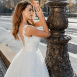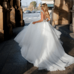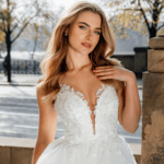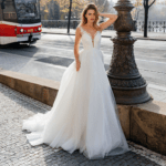 Vestido de Noiva, corte princesa, decote ilussão em V, feito em tule e renda, bordado com pedraría.