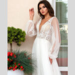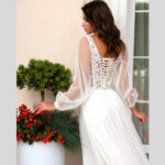 Vestido de Noiva corte A, decote e costas em V, feito em tule e renda com alta qualidade.