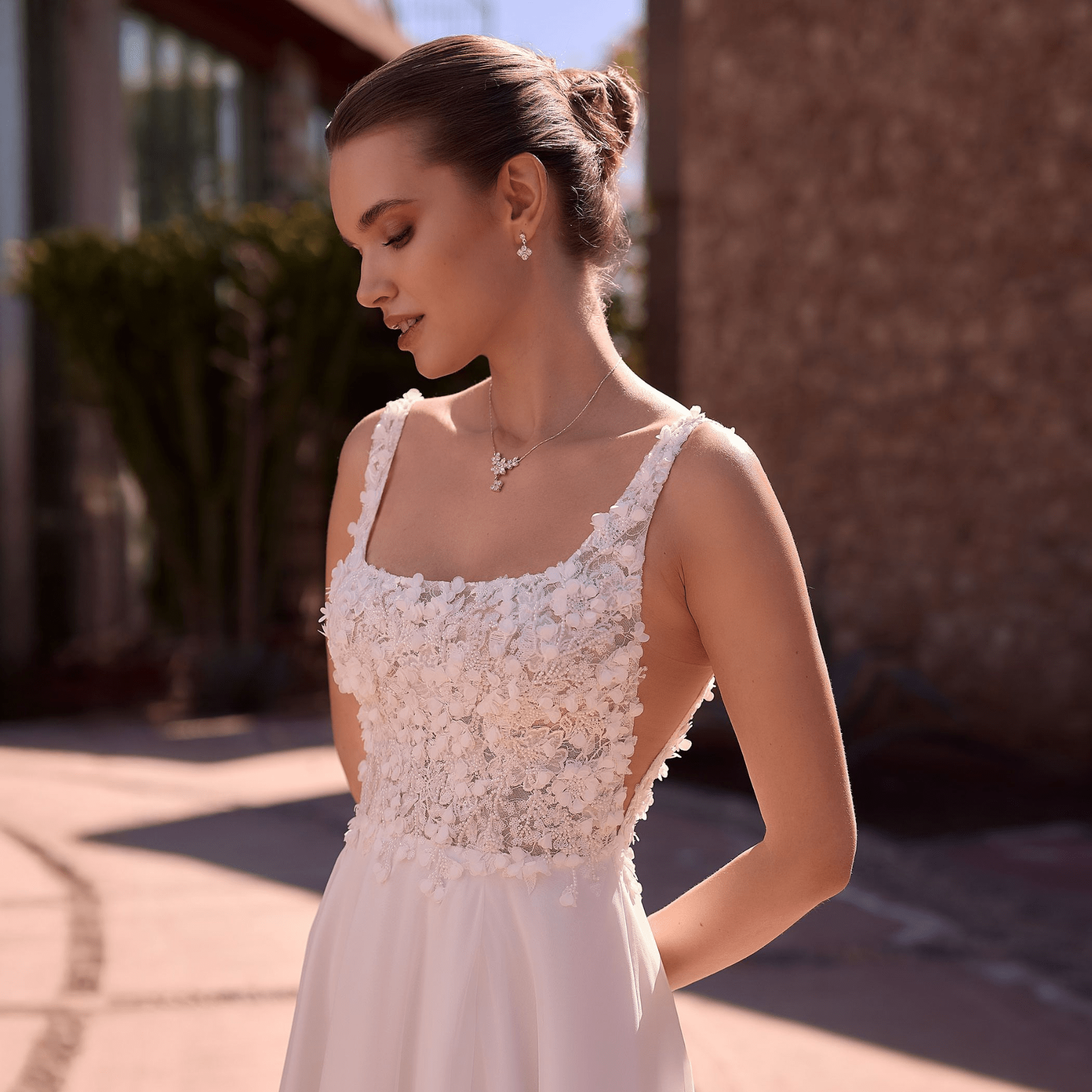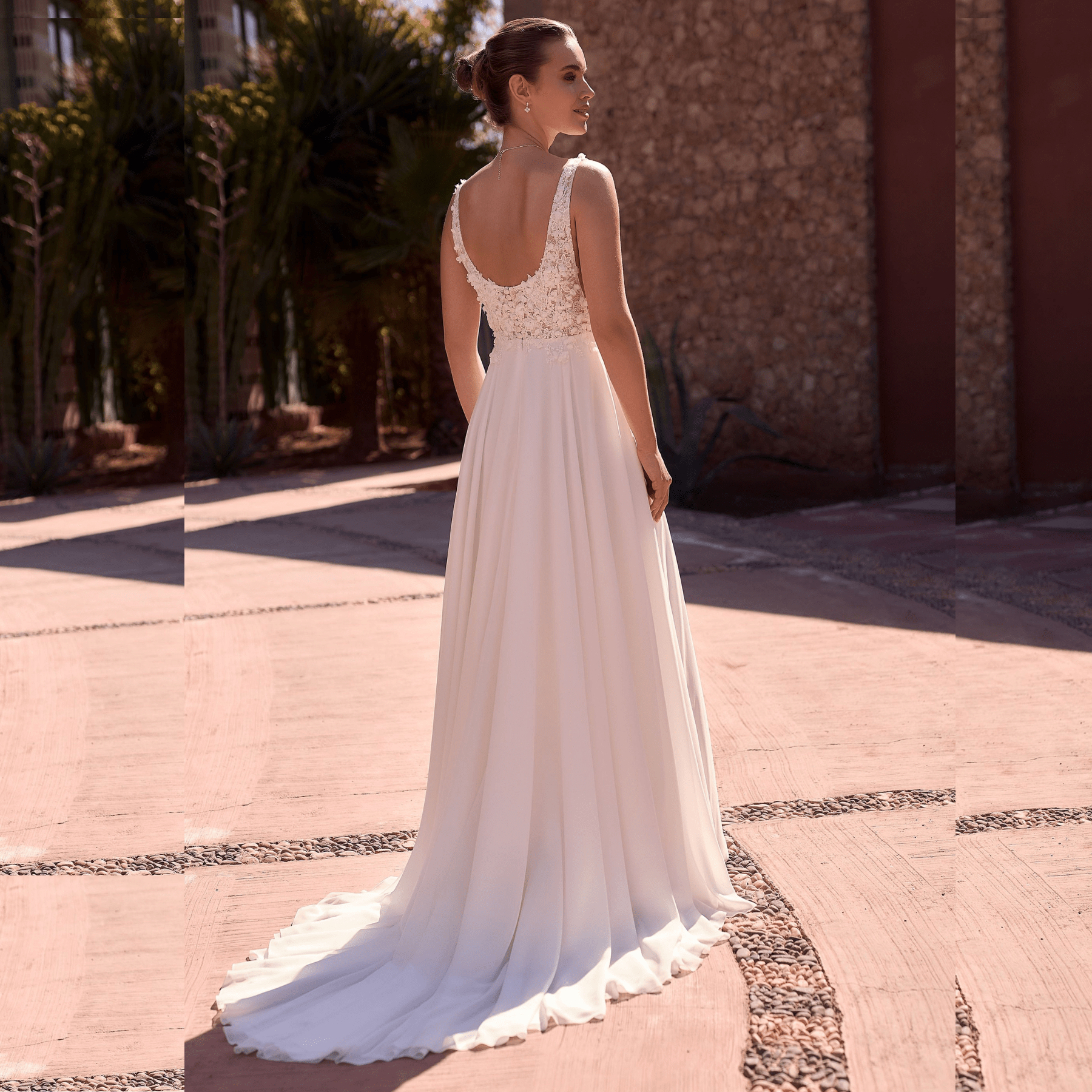 Vestido de Noiva corte A, com alcinhas, feito em chiffon e renda.