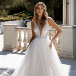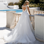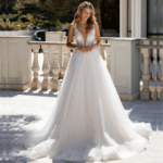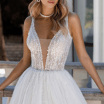Vestido de Noiva, corte A, decote em V profundo, feito em tule, renda e pedraría.