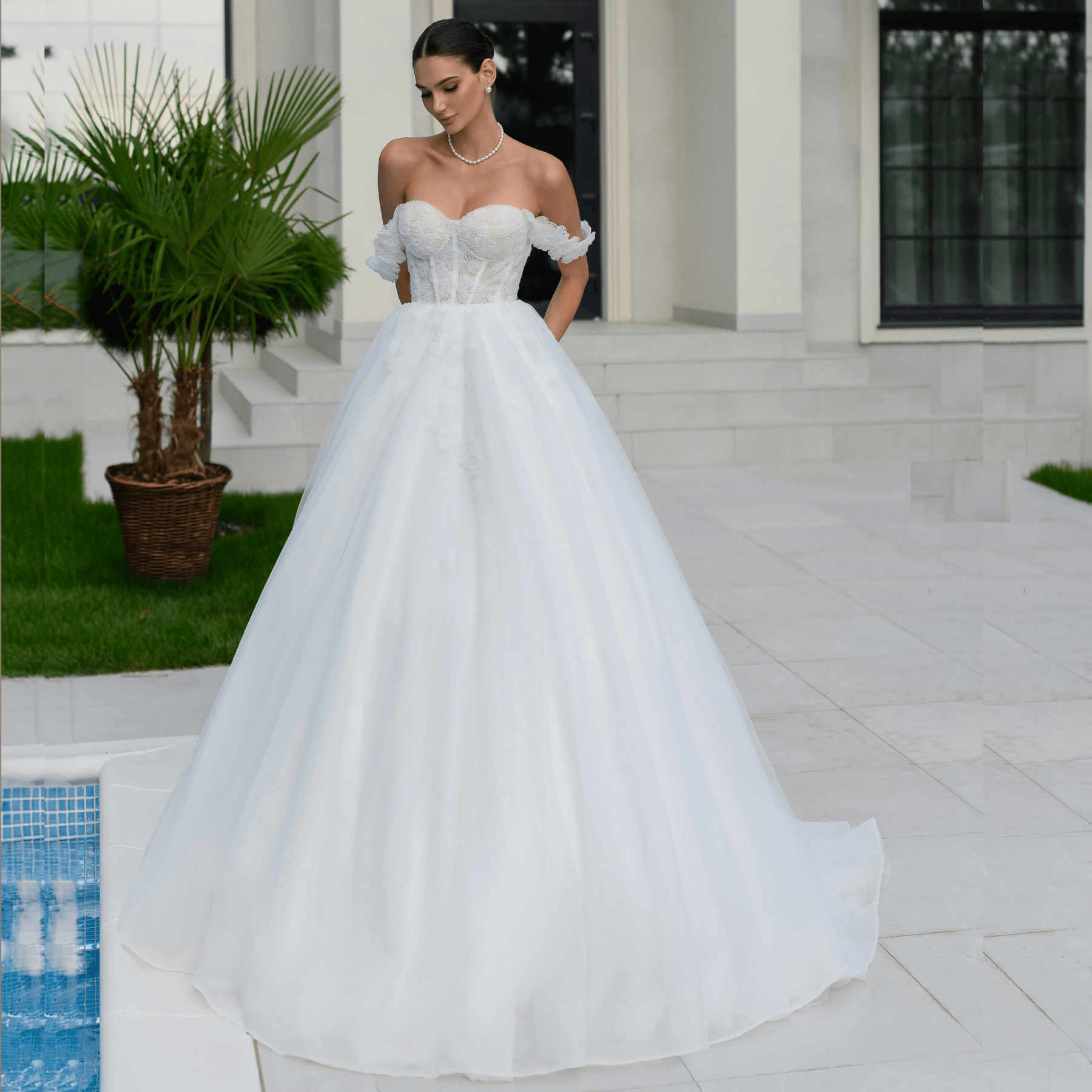 Vestido de Noiva cai cai em coração, feito em tule e renda com pedraría.