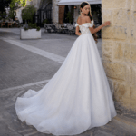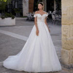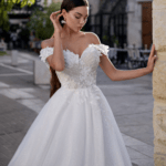 Vestido de Noiva, corte princesa, decote coração ombro a ombro, feito em organza brilhante e renda com pedraría.