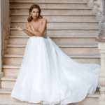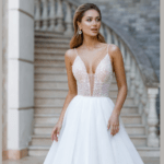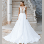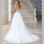 Vestido de Noiva corte A, decote em V com alcinhas.