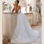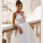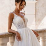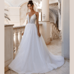 Vestido de Noiva corte A, decote em V com alcinhas e pedraría.
