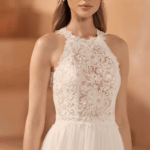 Vestido de Noiva corte A, decote halter, feito em tule e renda.