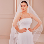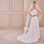 Lindo Véu de Noiva de uma camada com tule de purpurina, com cristais em volta.